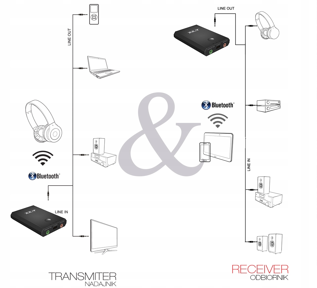 - Współpracuje z każdym nadajnikiem jak smartfon/tablet/laptop lub odbiornikiem jak głośnik, słuchawki z technologią Bluetooth