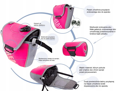 Active Case rozwiązuje odwieczny problem - co zrobić z torbą i osłoną na obiektyw podczas robienia zdjęć.Etui przeznaczone jest do przechowywania i ochrony cyfrowych lustrzanek i aparatów ultrazoom. Wykonane z elastycznego materiału, znakomicie pasuje do większości dostępnych na rynku modeli. Dodatkową zaletą jest to, że po wyjęciu aparatu etui można zrolować uzyskując kompaktowy rozmiar. Wówczas możliwe jest przechowywanie go w kieszeni torby podróżnej, torebki damskiej itp. Wewnętrze etui, wykonane z bardzo miękkiego materiału, chroni aparat przed zarysowaniami.Klapa zamykana za pomocą taśmy samoprzylepnej, co umożliwia błyskawiczny dostęp do sprzętu. Taśma wykonana jest z miękkiego materiału, dzięki czemu otwieranie i zamykanie torby jest bardzo łatwe, powierzchnia nie przywiera do ubrań, a dźwięk towarzyszący otwieraniu i zamykaniu jest zminimalizowany. Duża powierzchnia taśmy na klapie ułatwia ścisłe dopasowanie etui do rozmiaru aparatu.Etui wyposażone jest również w pasek zapinany na napę. Używając paska można przymocować etui do aparatu podczas robienia zdjęć.Po zewnętrznej stronie klapy znajduje się kieszonka na osłonę obiektywu. Możliwość przechowywania osłony zawsze w tym samym miejscu jest to bardzo wygodnym rozwiązaniem.