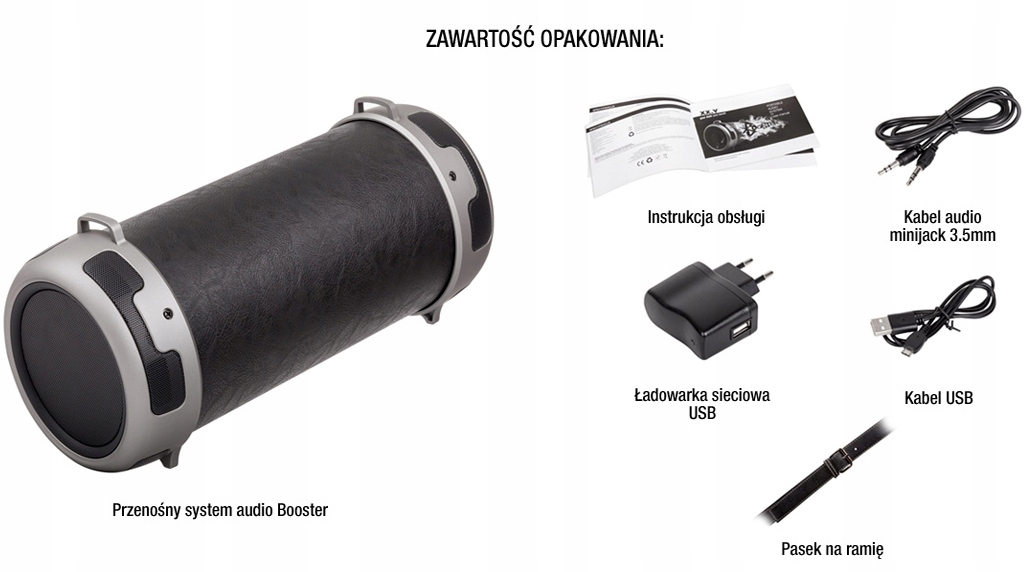 Przenośny system audio wyposażony w technologię Bluetooth, umożliwiającą bezprzewodowe odtwarzanie muzyki z urządzeń typu smartfon, tablet czy laptop. Posiada gniazdo kart microSD, złącze AUX minijack 3,5mm oraz port microUSB pozwalający zamienić urządzenie w głośnik komputerowy. Wbudowane radio FM, o pełnym zakresie częstotliwości, umożliwia słuchanie ulubionych stacji radiowych. Urządzenie jest kompatybilne z większością odtwarzaczy dźwięku, smartfonów, tabletów i laptopów.