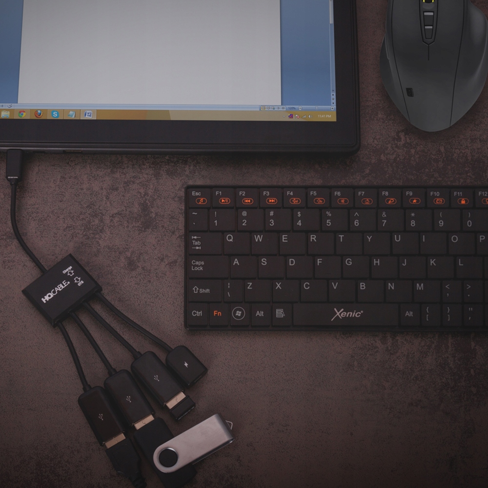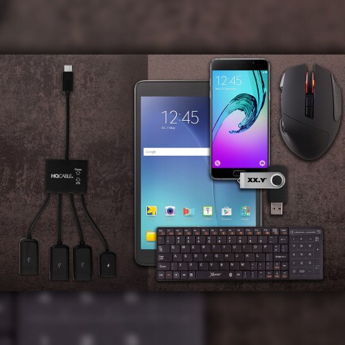 Tryb OTG: trzy gniazda USB umożliwiają jednoczesne podłączenie do smartfona lub tabletu (wyposażonego w port microUSB) urządzeń takich jak pendrive, dysk zewnętrzny, mysz komputerowa czy klawiatura.