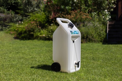 Zastosowanie tego mobilnego rekuperatora wody o pojemności 55 litrów jest częścią ekologicznego podejścia polegającego na odzyskiwaniu i wykorzystywaniu wody deszczowej do podlewania plantacji.