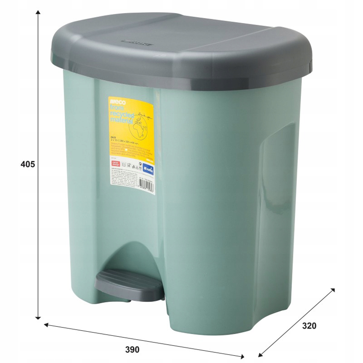 Kosz na śmieci DUO w kolorze zielonym o wymiarach 39 x 32 x 40,5 cm (dł. X szer. X wys.) to estetyczne rozwiązanie do segregacji śmieci dzięki nowoczesnemu wzornictwu. Dwa pojemniki o pojemności 10 litrów każdy oraz obudowa wykonane są z przyjaznego dla środowiska tworzywa sztucznego niezawierającego BPA. Wiadro jest łatwe do czyszczenia i nie pozostawia śladów palców, uderzeń i plam rdzy. Pokrywę kosza na śmieci DUO można bezgłośnie otwierać i zamykać za pomocą pedału. Cztery gumowe nóżki zapewniają stabilną postawę i bezpieczeństwo podczas przewracania. Kosze na śmieci z serii DUO są dostępne w różnych kolorach i pojemnościach 10 i 28 litrów, niezależnie od tego, czy są to pojedyncze gospodarstwa domowe, rodziny czy miejsca pracy.