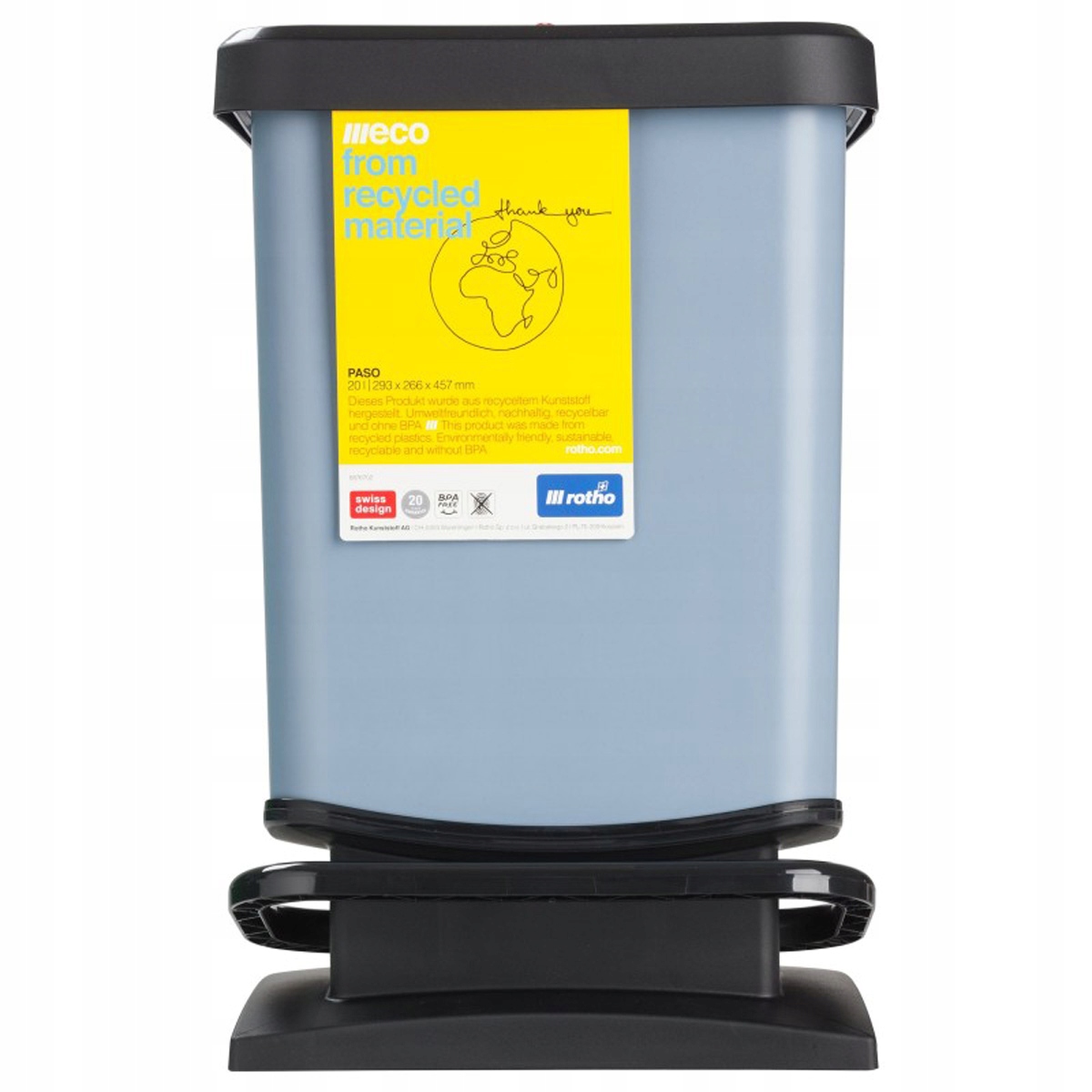 Kosze z serii PASO to produkty najwyższej jakości szwajcarskiej marki ROTHO. Świadczy o tym 20letnia gwarancja udzielana przez producenta. Występują w pięciu różnych pojemnościach: 6, 20, 30, 40 oraz 50 litrów. Wyglądem kosze PASO przypominają kosze metalowe, choć w rzeczywistości zostały wykonane z plastiku powleczonego folią IML imitującą metalową powierzchnię. Dzięki temu są odporne na zabrudzenia i prezentują się znakomicie nawet bez regularnego czyszczenia. Zalety estetyczne idą w tym przypadku z walorami użytkowymi, takimi jak chociażby cicho zamykająca się pokrywa wyposażona w innowacyjny system amortyzujący opadającą klapę. Klapa jest otwierana za pomocą wygodnego i długiego przycisku pedałowego, co odciąża kręgosłup, gdyż nie trzeba się schylać w celu wyrzucenia śmieci. Kosze PASO wyróżniają się uniwersalnością pozwalającą zastosować je w dosłownie każdym pomieszczeniu, niezależnie od sposobu urządzenia wnętrza.