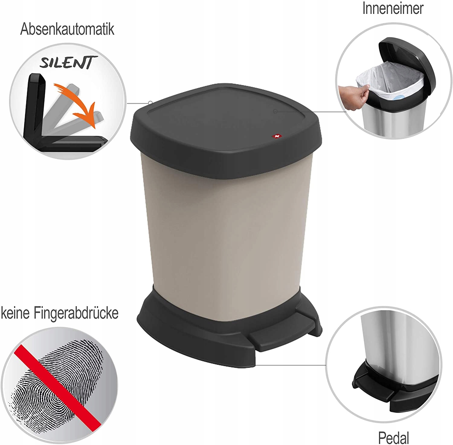 Karbonowy kosz na opakowania po kosmetykach PASO przekonuje wysoką jakością i trwałością produktu. Dzięki wymiarom 23,4 x 21,9 x 29,5 cm i pojemności 6 litrów ten pojemnik na śmieci nadaje się szczególnie do małych i średnich pomieszczeń. Prawdziwa metalowa obudowa o szlachetnym wyglądzie stali nierdzewnej jest niewrażliwa na rdzę i wgniecenia i nadaje się do bezpiecznego użytkowania w mokrych pomieszczeniach. Kosz wykonany z wysokiej jakości tworzywa sztucznego jest jednocześnie lekki i wytrzymały. Wygodną obsługę zapewnia praktyczna funkcja schodkowa. Szczelnie zamykająca się pokrywa cicho obniża się i zapewnia niezawodną ochronę przed ulatniającymi się zapachami. Stabilne gumowe nóżki gwarantują bezpieczne ustawienie bez poślizgu, nawet na podłogach z płytek. Kosz na odpady po kosmetykach w razie potrzeby można nawet umyć w zmywarce. Kosze na opakowania po kosmetykach PASO są dostępne w wielu innych wariantach kolorystycznych i objętościowych. Linia PASO obejmuje również kosze z pedałami „Pedalbin” w rozmiarach 20 l, 40 li 50 l oraz „Pushbin” o pojemności 40 l. Wszystkie kosze z pedałami PASO są poddawane procesom produkcyjnym przyjaznym dla środowiska i są objęte dwudziestoletnią gwarancją trwałości.