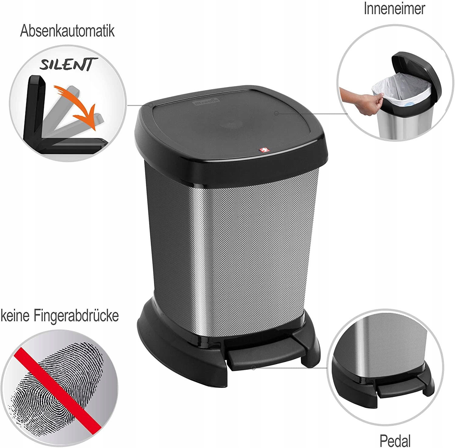 Karbonowy kosz na opakowania po kosmetykach PASO przekonuje wysoką jakością i trwałością produktu. Dzięki wymiarom 23,4 x 21,9 x 29,5 cm i pojemności 6 litrów ten pojemnik na śmieci nadaje się szczególnie do małych i średnich pomieszczeń. Prawdziwa metalowa obudowa o szlachetnym wyglądzie stali nierdzewnej jest niewrażliwa na rdzę i wgniecenia i nadaje się do bezpiecznego użytkowania w mokrych pomieszczeniach. Kosz wykonany z wysokiej jakości tworzywa sztucznego jest jednocześnie lekki i wytrzymały. Wygodną obsługę zapewnia praktyczna funkcja schodkowa. Szczelnie zamykająca się pokrywa cicho obniża się i zapewnia niezawodną ochronę przed ulatniającymi się zapachami. Stabilne gumowe nóżki gwarantują bezpieczne ustawienie bez poślizgu, nawet na podłogach z płytek. Kosz na odpady po kosmetykach w razie potrzeby można nawet umyć w zmywarce. Kosze na opakowania po kosmetykach PASO są dostępne w wielu innych wariantach kolorystycznych i objętościowych. Linia PASO obejmuje również kosze z pedałami „Pedalbin” w rozmiarach 20 l, 40 li 50 l oraz „Pushbin” o pojemności 40 l. Wszystkie kosze z pedałami PASO są poddawane procesom produkcyjnym przyjaznym dla środowiska i są objęte dwudziestoletnią gwarancją trwałości.