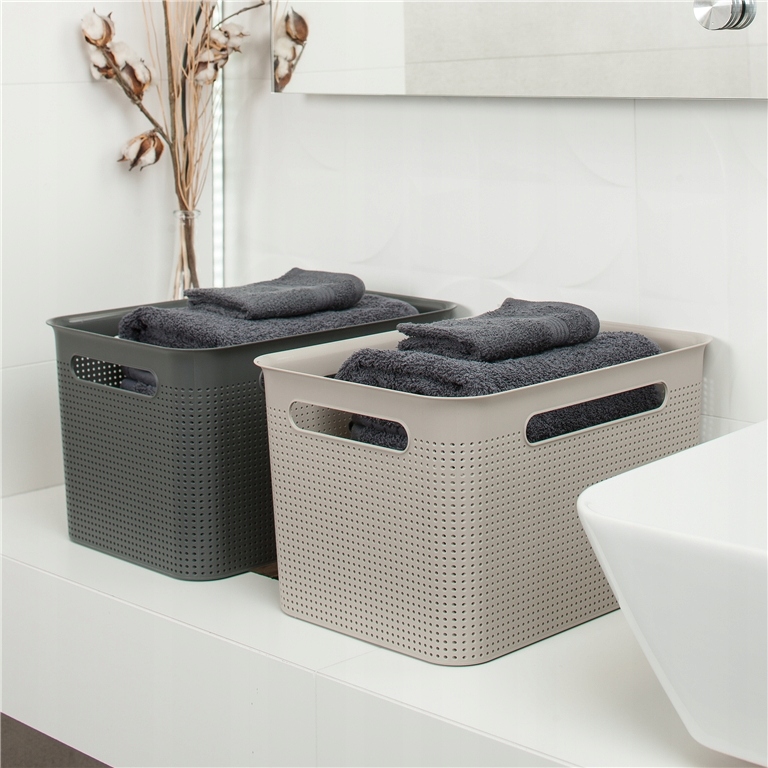 Pojemnik, koszyk do przechowywania Brisen charakteryzuje prosty i stylowy design. Świetnie komponuje się z klasyczną jak i nowoczesną aranżacją wnętrz. Unikalny i ergonomiczny kształt produktu pozwoli w prosty sposób zagospodarować wolną przestrzeń regału czy półki. Posiada uchwyty ułatwiające użytkowanie produktu. Wykonany z wysokiej jakości tworzywa sztucznego.