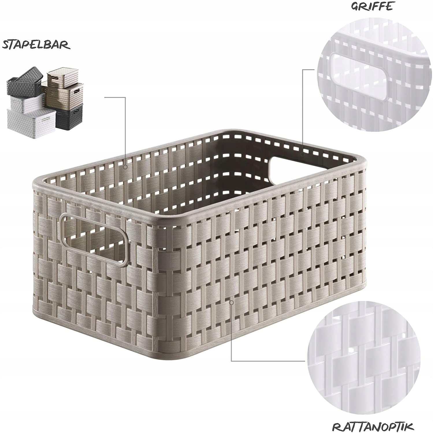Schludne życie bez długich poszukiwań - dzięki koszykom Rotho COUNTRY jest to w końcu możliwe. Niezależnie od tego, czy jest to miejsce do przechowywania czasopism w salonie, czy na korytarzu, czy jako miejsce na chusty i czapki, czy też pudełko na zabawki, wszystko, co jest otwarte, zmieści się w pudełkach do ustawiania w stosy. Łatwe w utrzymaniu kosze COUNTRY są łatwe do przenoszenia w razie potrzeby z jednego pokoju do drugiego. W łazience niewrażliwe na wilgoć koszyki zapewniają uporządkowane i bezpieczne przechowywanie produktów pielęgnacyjnych lub ręczników gości.
