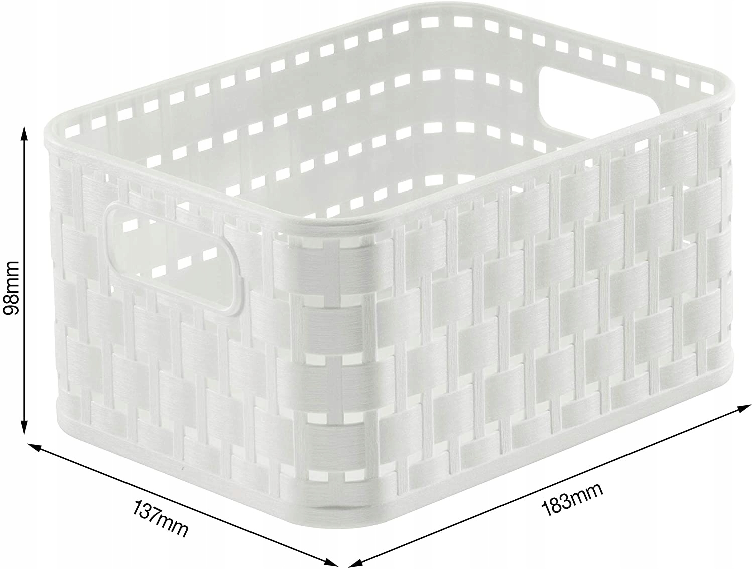 Kosz COUNTRY A6 w kolorze białym o wymiarach 183 x 137 x 98 mm (dł. X szer. X wys.). Charakteryzuje się domowym wyglądem rattanu. Każde plastikowe pudełko nadaje się do życia bez alergii. Prostokątne ozdobne pudełko o pojemności 2 litrów nadaje się do przechowywania większych i mniejszych przedmiotów. Dzięki szerokiej gamie kolorów dekoracyjne pudełka do przechowywania uzupełniają nowoczesne meble mieszkalne i rustykalne. System organizacji COUNTRY oferuje kosze prostokątne i kwadratowe w rozmiarach: A6, A6 +, A5, A5 +, A4, A4 +. Ładne pudełka w formacie A4 uzupełniają wieżę COUNTRY od Rotho.