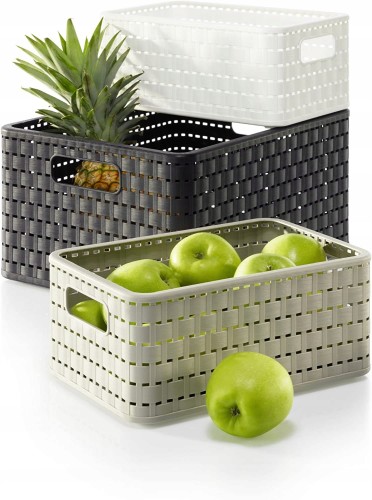 Kosz COUNTRY A5 + w kolorze białym o wymiarach 328 x 238 x 160 mm (dł. X szer. X wys.). Charakteryzuje się domowym wyglądem rattanu. Każde plastikowe pudełko nadaje się do życia bez alergii. Prostokątne ozdobne pudełko o pojemności 11 litrów nadaje się do przechowywania większych i mniejszych przedmiotów. Dzięki szerokiej gamie kolorów dekoracyjne pudełka do przechowywania uzupełniają nowoczesne meble mieszkalne i rustykalne. System organizacji COUNTRY oferuje kosze prostokątne i kwadratowe w rozmiarach: A6, A6 +, A5, A5 +, A4, A4 +. Ładne pudełka w formacie A4 uzupełniają wieżę COUNTRY od Rotho.