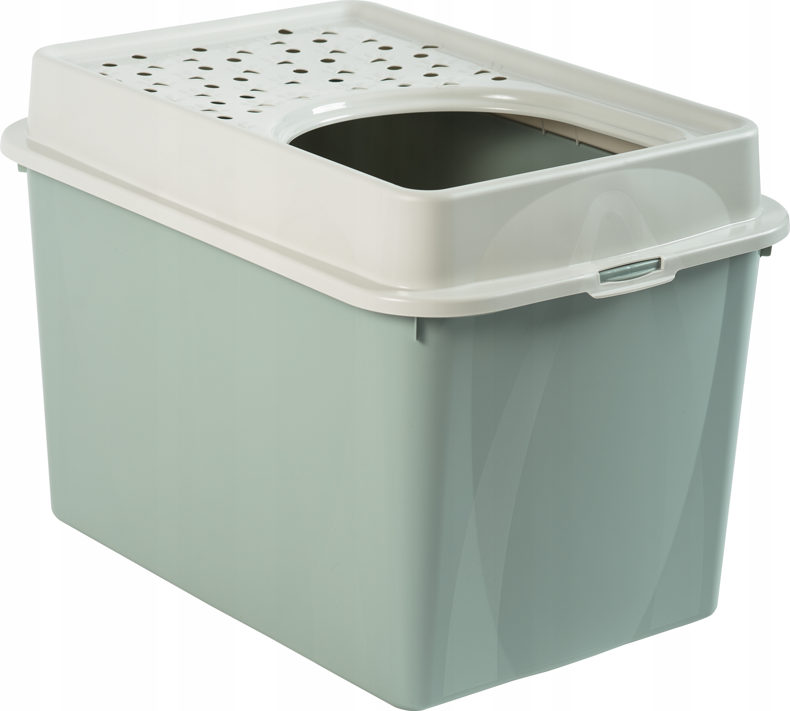 Nowoczesna kuweta z wejściem u góry. Odpowiednia również dla dużych ras dzięki dużemu otworowi. Pojemnik jest szeroki i głęboki, co pozwala każdemu kotu znaleźć swoje miejsce. Wysokie boczne ściany zapewniają ochronę przed przeciekaniem. Pokrywa kuwety zaprojektowana tak, aby jak najmniej żwirku wydostawało się na zewnątrz wraz z kocimi łapami dzięki małym otworom w krztałcie kocich łapek. Zdejmowana pokrywa umożliwia łatwe czyszczenie.