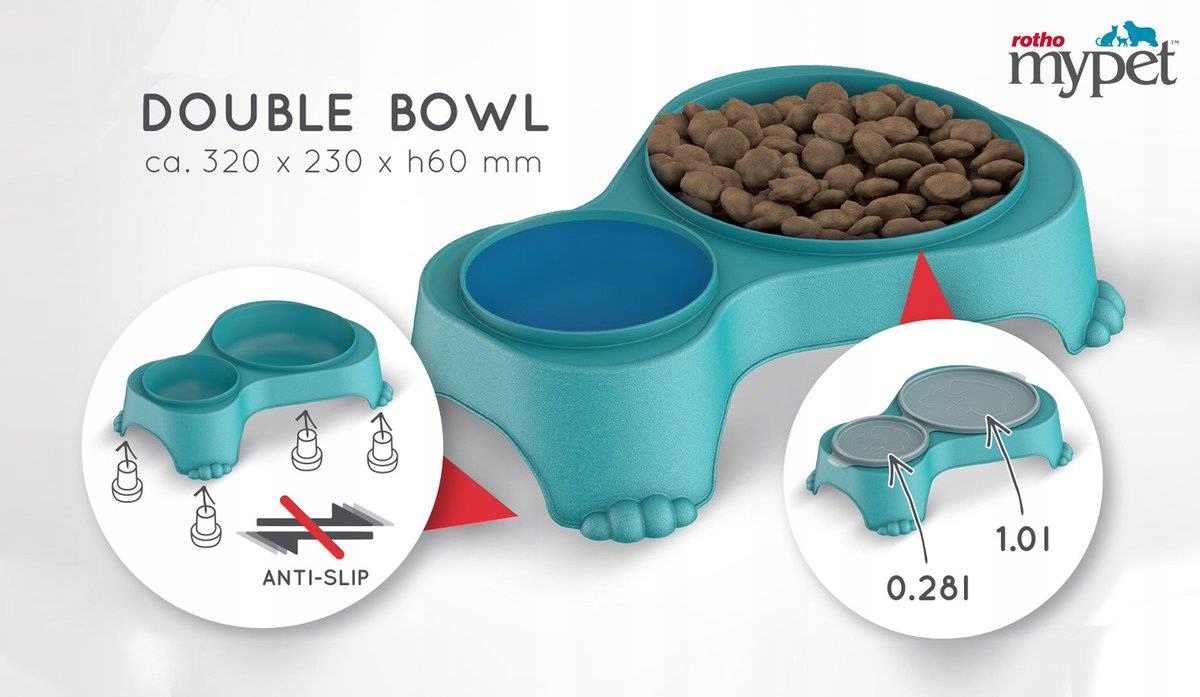 - Podwójna miska na jedzenie i picie o pojemności 1litra oraz 0,28l