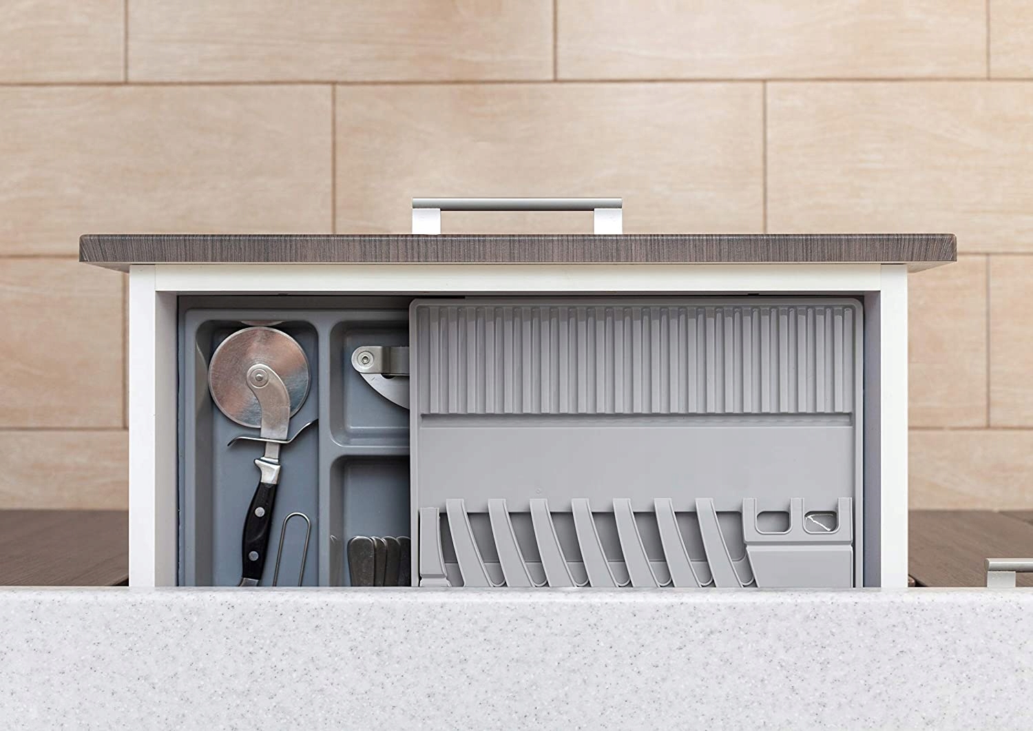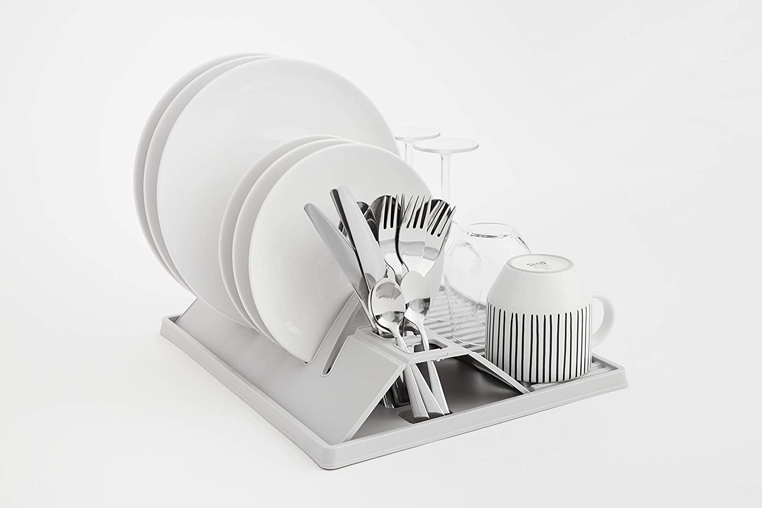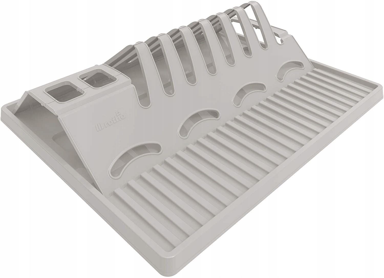 - składana taca - użyj tych dwóch stanów, aby wysuszyć naczynia tak skutecznie, jak to możliwe lub aby schować stojak do ociekania w szufladzie kuchennej; ten artykuł pasuje do prawie każdego płaskiego suwaka i nie zajmuje dużo miejsca podczas użytkowania,