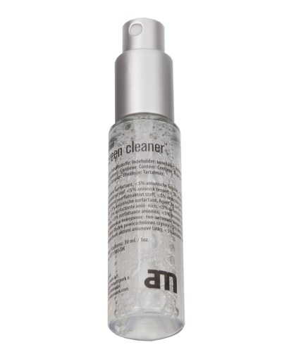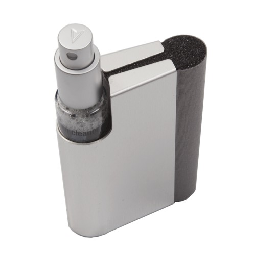 - Posiada środek czyszczący w płynie, na bazie wody (nie zawiera alkoholu), który rozprowadzany jest w sprayu oraz gąbkę z powłoką mikrofibry do usuwania zanieczyszczeń.