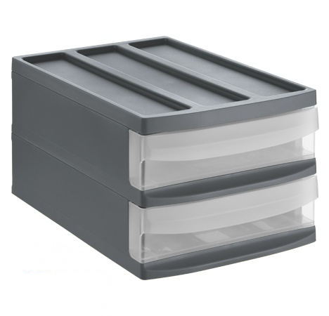 Pojemnik z szufladami SYSTEMIX średniej wielkości wyposażony jest w dwie szuflady, które przesuwają się bez wysiłku dzięki prowadnicy na rolce. Szuflady nie mogą wypaść dzięki praktycznemu wysuwanemu zamkowi. Stabilne gumowe nóżki na podłodze zapewniają solidne oparcie pojemnika i zapobiegają zadrapaniom na wrażliwych podłogach. Pojemnik z szufladami SYSTEMIX jest również dostępny w 5 innych rozmiarach. Wszystkie warianty produktu można układać jeden na drugim, zgodnie z potrzebami, a tym samym rozszerzać w indywidualny system organizacji.