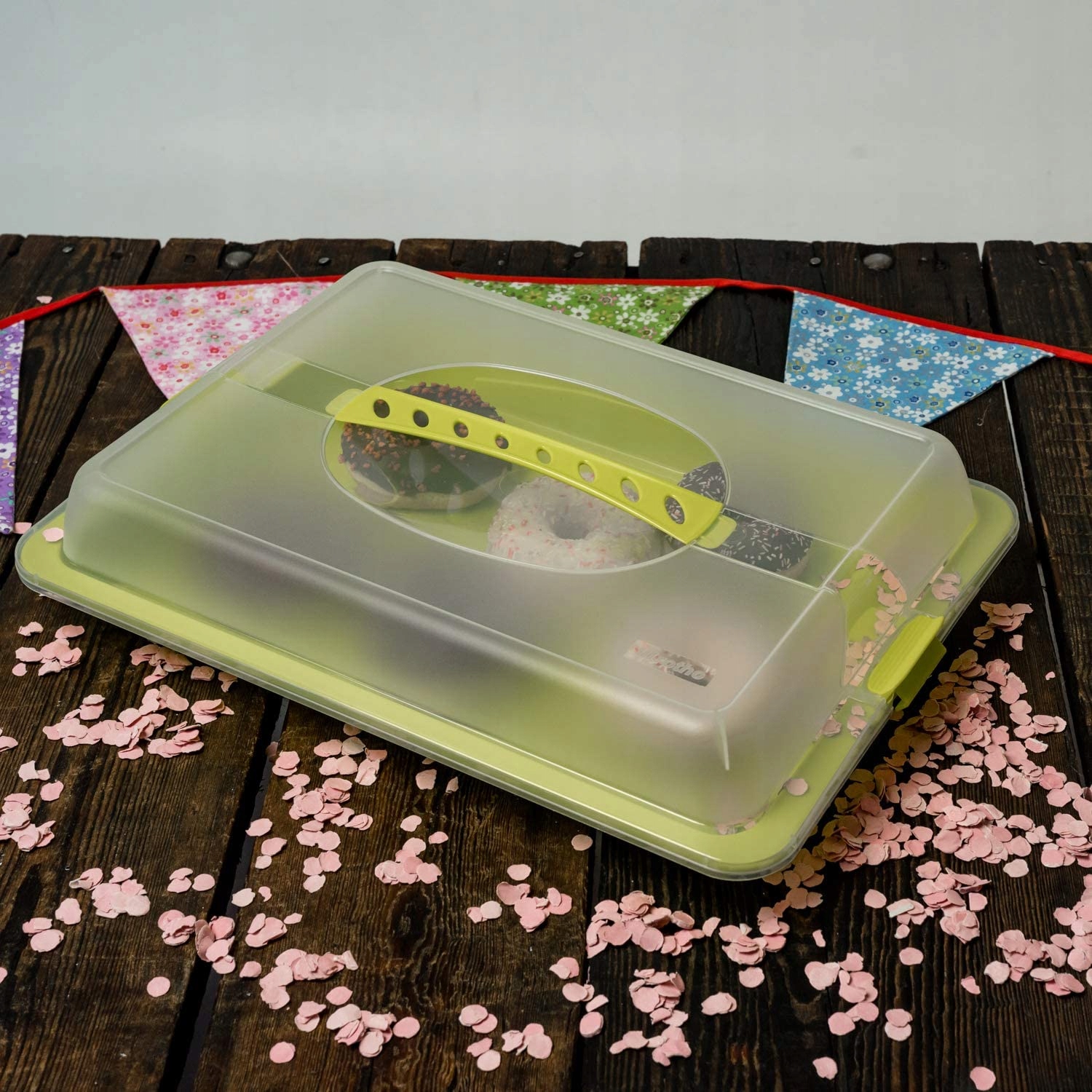 Prostokątny pojemnik PARTY nadaje się idealnie do przechowywania ciast lub innych słodkości. Praktyczny i pojemny, łatwy w utrzymaniu i odporny na mycie w zmywarce. Doskonale sprawdza się także jako pojemnik do transportu żywności. Dzięki wytrzymałemu uchwytowi przenoszenie pojemnika jest pewne i bezpieczne. Wolny od BPA.