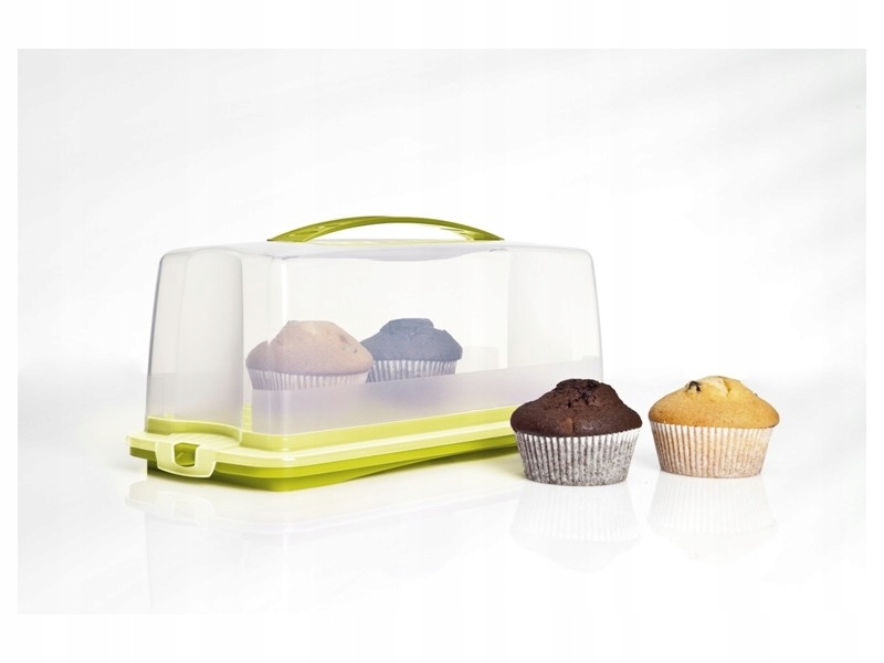 Uchwyt znajdujący się na pojemniku zapewnia zrównoważony i bezpieczny transport. Dzięki bezpiecznemu zamknięciu nigdy nie doświadczysz upadku z upadłym lub pokruszonym ciastem.