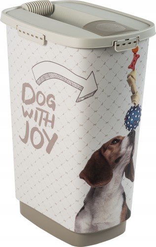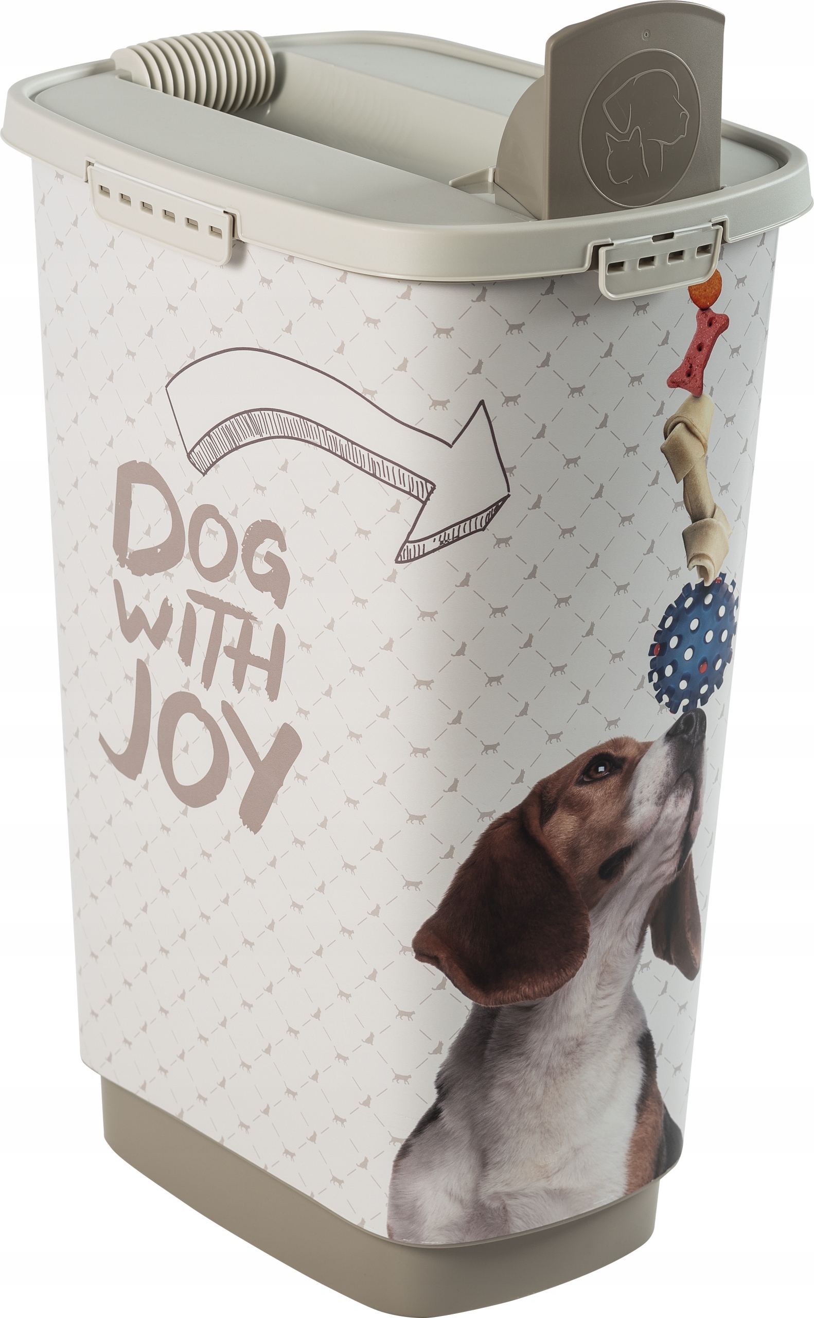 Pojemnik na suchą karmę o pojemności 50l lub max 25kg(uzależnione od granulacji oraz gęstości karmy). Idealny dla właścicieli psów dużych ras spożywających dziennie spore ilości racji pokarmowych. Umieszczona po wewnętrznej stronie pokrywy uszczelka pomaga chronić zawartość przed wilgocią, wysychaniem, utratą wartości smakowych i odżywczych oraz zapobiega wydostawaniu się na zewnątrz charakterystycznego zapachu psiej karmy. Zamknięcie na 4 solidne klipsy znacznie ogranicza prawdopodobieństwo przypadkowego rozsypania jedzenia. Wygodne uchwyty umożliwiają komfortowe trzymanie pojemnika i wraz z uchylną klapką pozwalają na szybkie uzupełnienie miski. Dołączona łopatka pomoże odmierzyć odpowiednią porcję jedzenia.