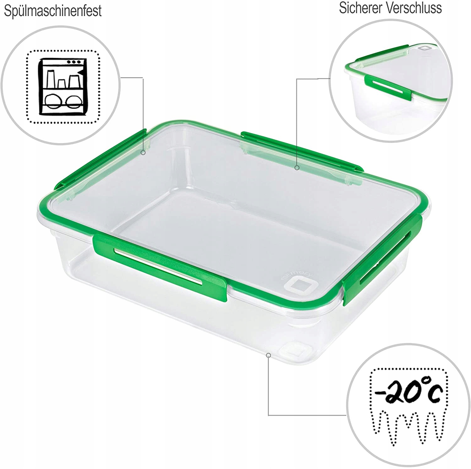 Pojemnik MEMORY jest wykonany z wysoce przezroczystego, wolnego od BPA i od zanieczyszczeń tworzywa sztucznego i można go oczywiście myć w zmywarce. Za pomocą odpowiedniej pokrywki jest bezpiecznie zamknięty. Praktyczny zamek zatrzaskowy jest bardzo łatwy w użyciu: wystarczy dwa kliknięcia, aby ponownie otworzyć lub zamknąć pojemnik. Łatwy w pielęgnacji pojemnik do przechowywania żywności jest - oprócz rozmiaru 3,1 l - dostępny również w 9 innych rozmiarach. Wszystkie produkty z tej linii można układać w stosy i mają jednolity kolor i kodowanie symboli, co ułatwia znalezienie odpowiedniego pojemnika. Stwórz sprytny system organizacji w swojej kuchni dzięki pojemnikom z linii MEMORY, które możesz w każdej chwili rozbudować!