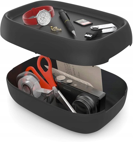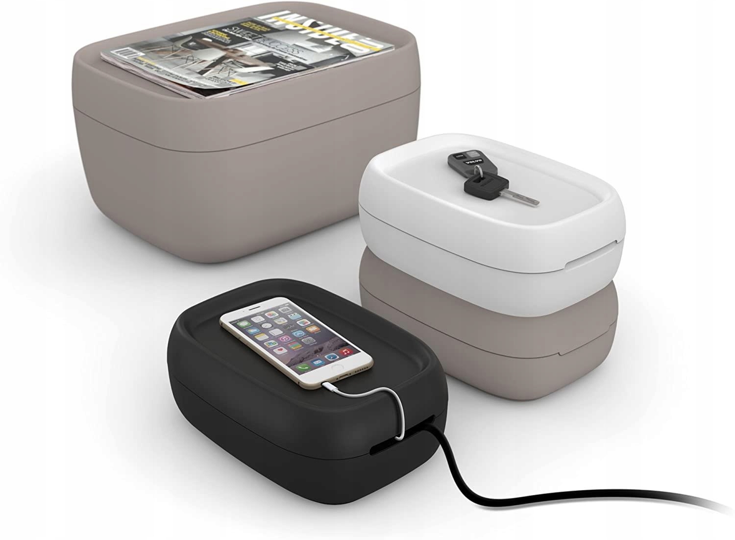 Pojemniki SOFIA to rewolucyjne rozwiązanie ułatwiające organizację domowych oraz biurowych akcesoriów. Organizery SOFIA w przeciwieństwie do zwykłych pudełek codziennego użytku odróżnia nowoczesny i elegancki design, stanowiący idealne uzupełnienie stylowych wnętrz. Zamiast chować pojemniki w szafce, możecie je wyeksponować jako kolejną ozdobę waszego wnętrza. Praktyczna konstrukcja pojemnika pozwala na schowanie akcesoriów do środka a rzeczy takie jak zegarek, pendrive czy telefon, które zawsze powinny być pod ręką, możemy umieścić na specjalnie wyprofilowanej w tym celu pokrywie. Dodatkowo mniejszy pojemnik może pełnić rolę schowka na kable, w tym celu został wyposażony w otwór umożliwiający przełożenie kabla od ładowarki. Dzięki temu w środku pojemnika możemy umieścić power bank lub mniejszych rozmiarów przedłużacz, nastepnie możemy rozpocząć ładowanie telefonu lub aparatu odkładając urządzenie na pokrywę pojemnika.