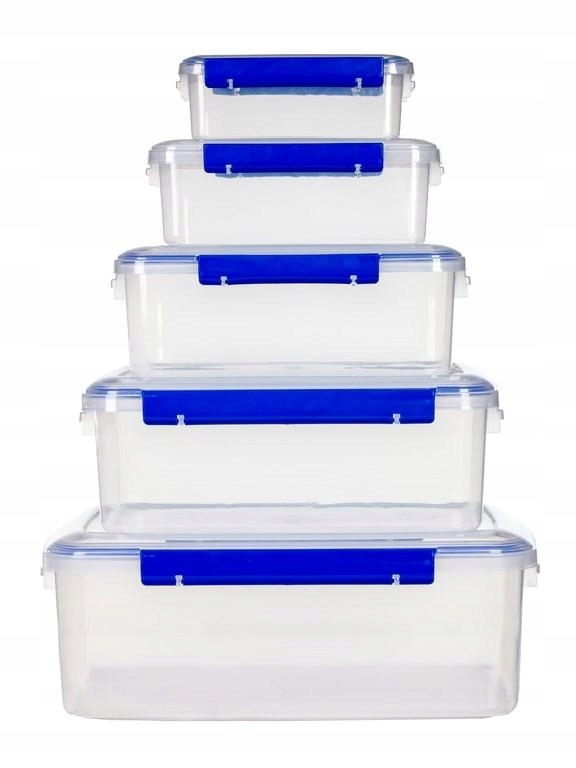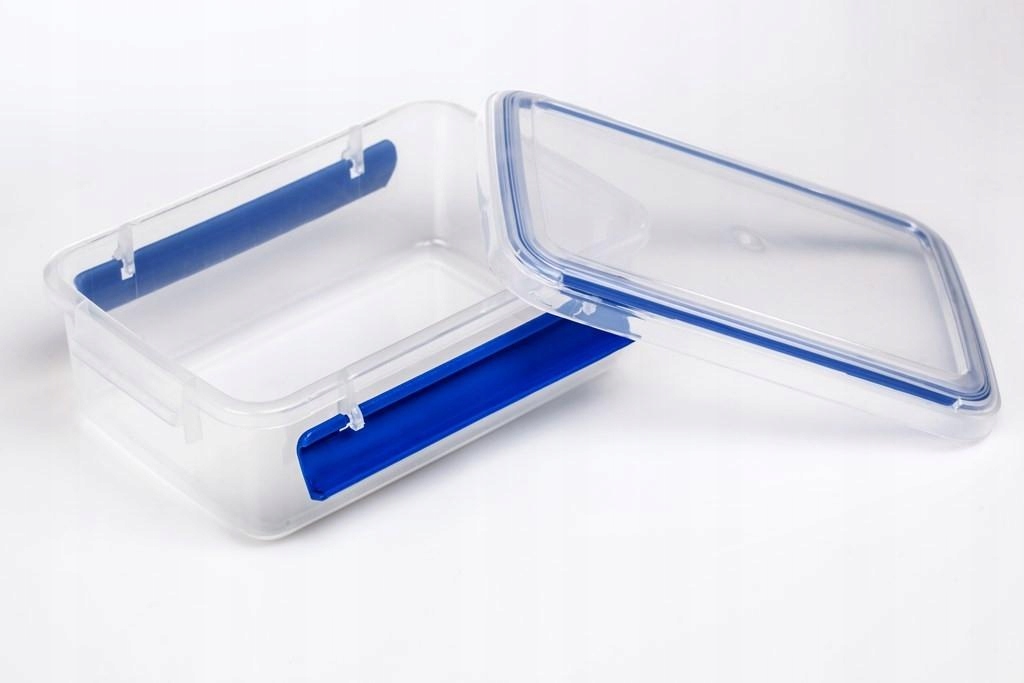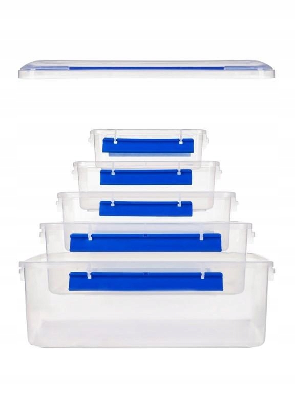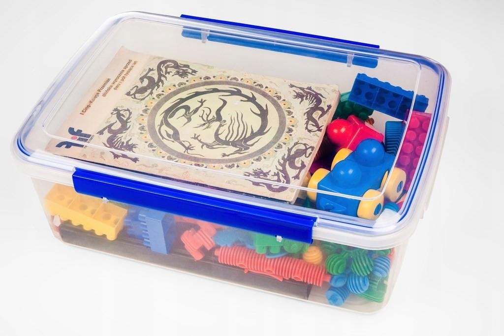 Pojemnik wykonany z twardego i wytrzymałego tworzywa sztucznego. Pokrywa i pojemnik jest w kolorze transparentnym, mocne uchwyty zamykające są w kolorze niebieskim. Pojemnik spełnia wiele funkcji, idealnie sprawdza się w magazynie, garażu, pokoju dziecięcym, garderobie czy kuchni. Pojemniki można układać jeden na drugim. Przeznaczony także do przechowywania żywności. Produkt wykonany z surowców nadających się do recyklingu.
