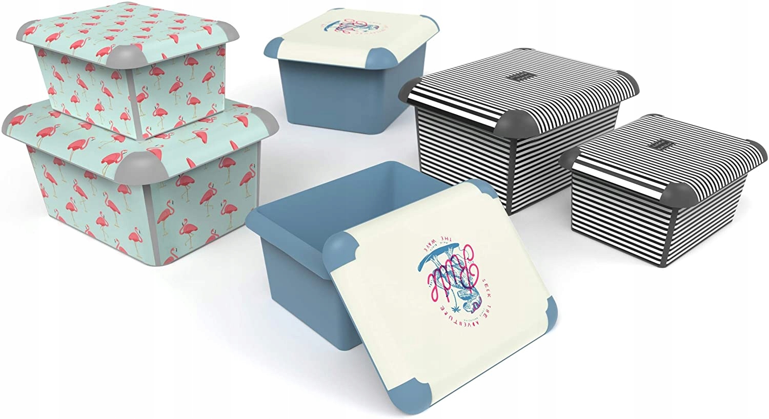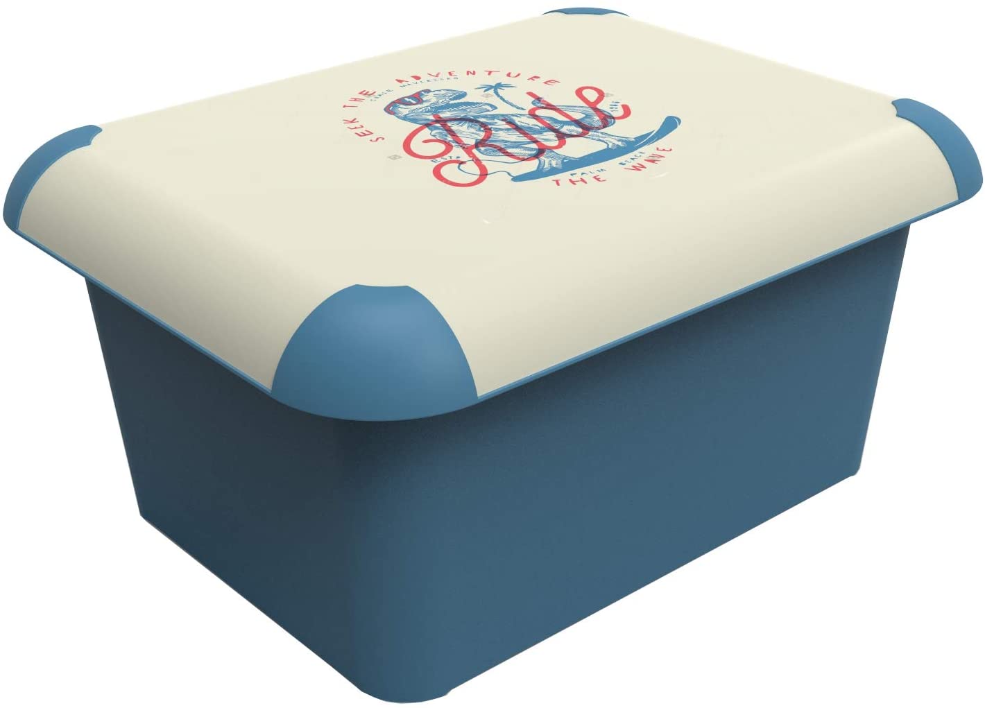 - design - Niebieskie pudełko z białą pokrywą, w tym modny napis Ride, rozluźnia twoje domostwo na półce lub w innym miejscu, na przykład w ogrodzie; świeży motyw tych pudeł Rotho jest dalej modernizowany i harmonizowany przez niebieskie rogi; co więcej, te plastikowe produkty mogą mieć lekko zaokrąglony kształt.