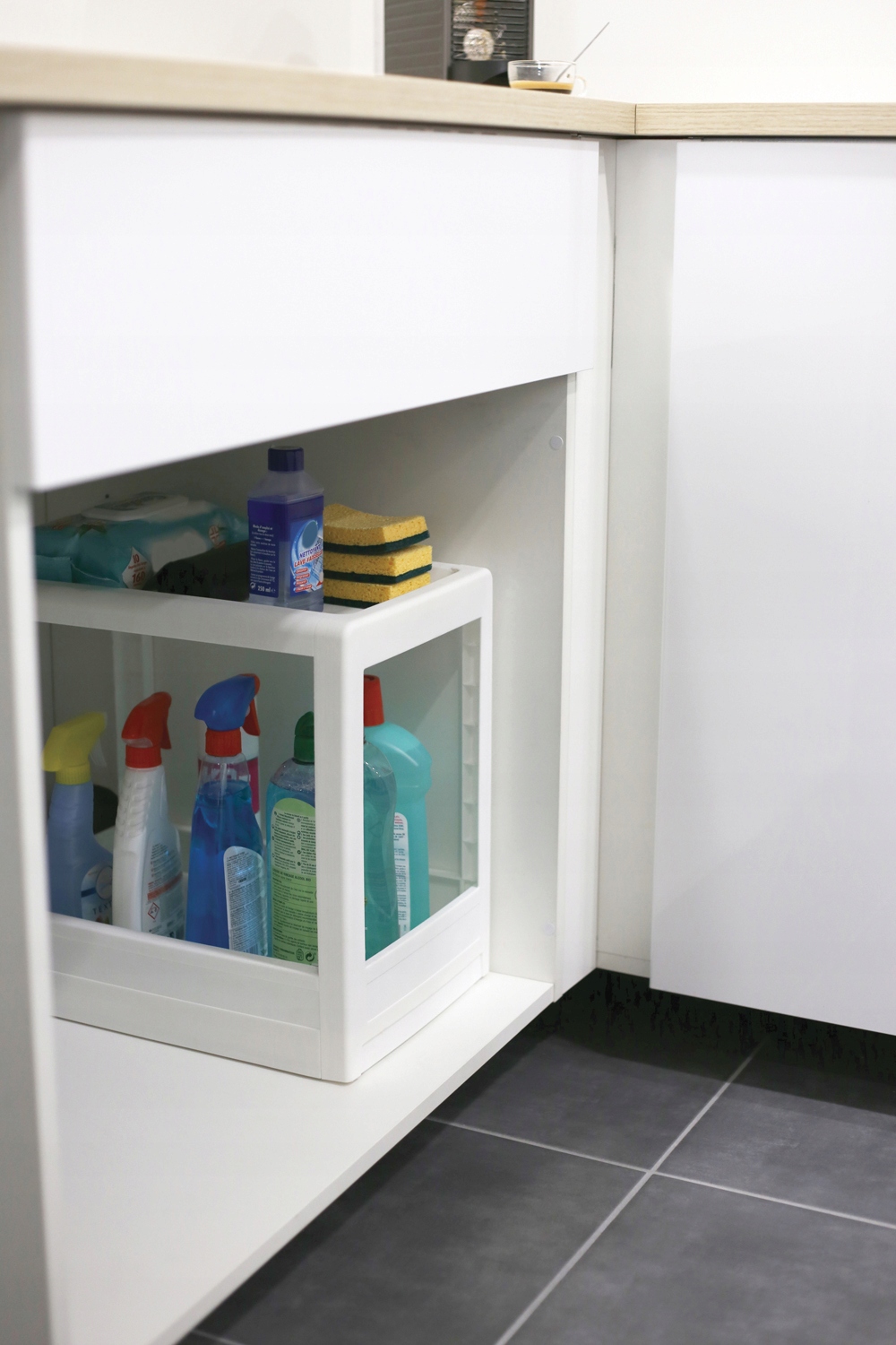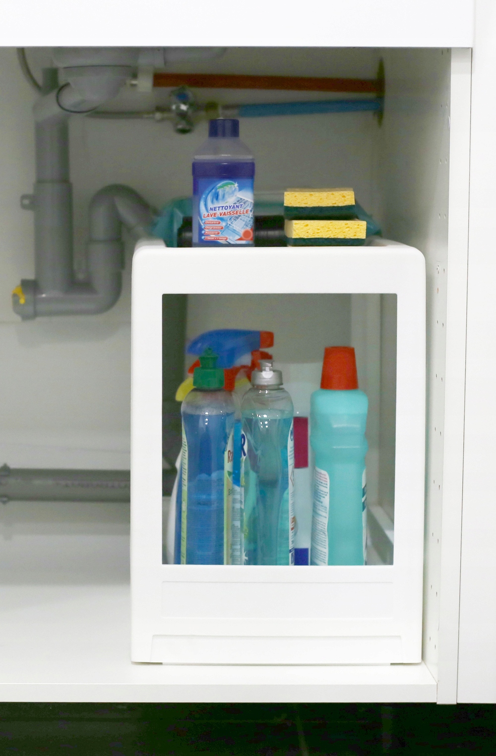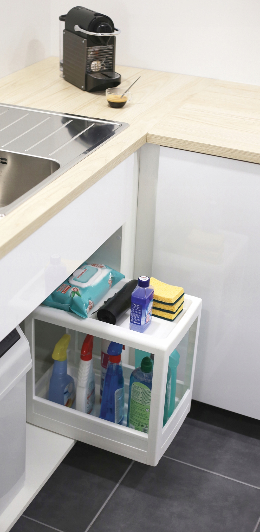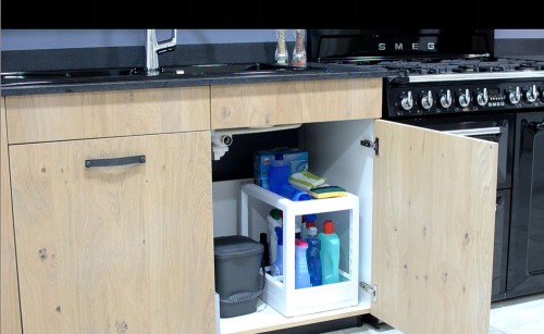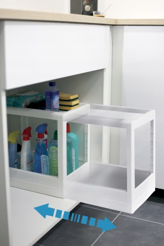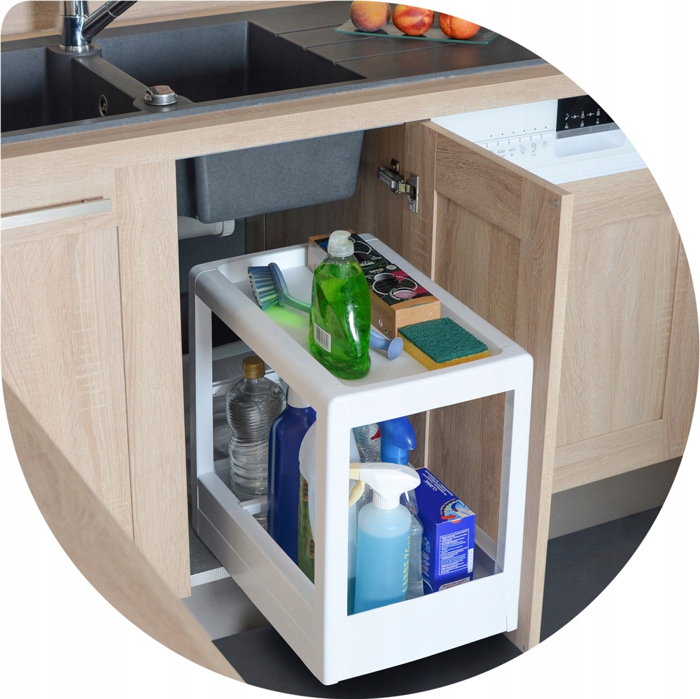 Wymiary tego przesuwanego na szynach regału zostały zbadane, aby pasowały do wszystkich szafek, kuchni, łazienki i będą miały szansę wejść pod zlew.