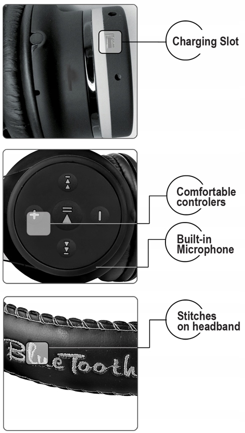Zasięg Bluetooth® 10m, Błyskawiczne łączenie z telefonem i tabletem, kontrolery na nauszniku, wbudowana bateria (słuchanie muzyki - do 5 godz,rozmowy do 5 godz.), ładowanie akumulatora poprzez kabel USB.