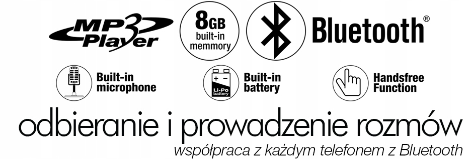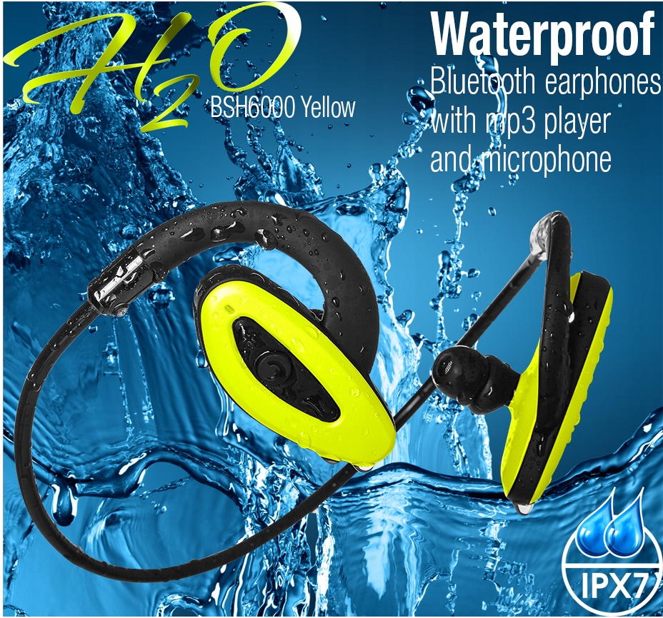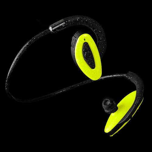 Wodoodporne słuchawki bezprzewodowe z łącznością Bluetooth, wbudowanym odtwarzaczem mp3 8GB oraz mikrofonem do rozmów telefonicznych.