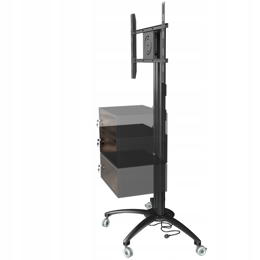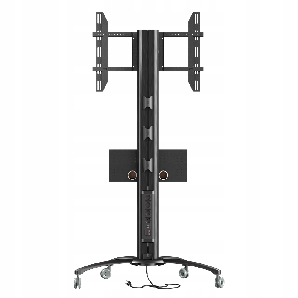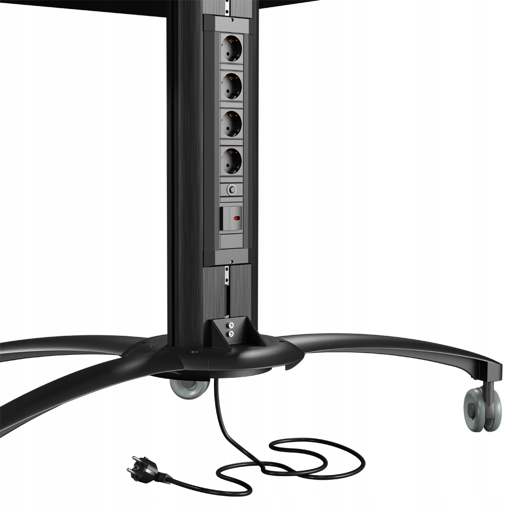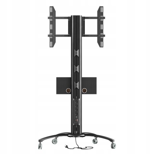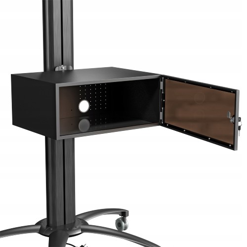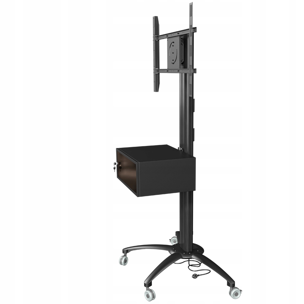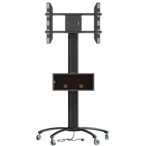 Stojak podłogowy z szafką, przeznaczony do montażu telewizora wraz z o sprzętem takim jak odtwarzacz DVD, Blu-Ray czy konsola do gier. Stojak wyposażony w 4-gniazdową listwę zasilającą.