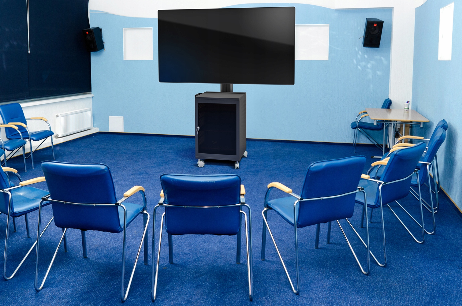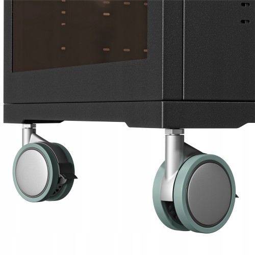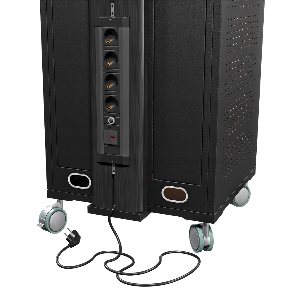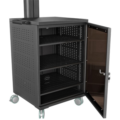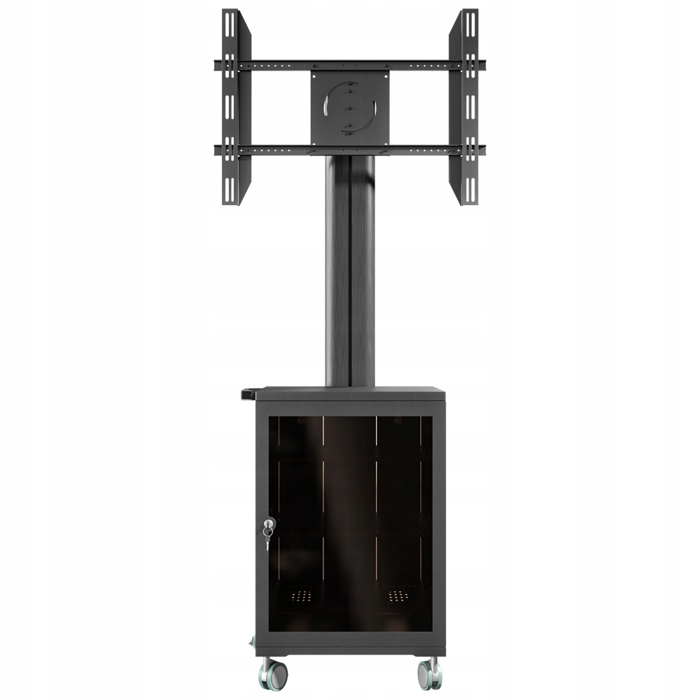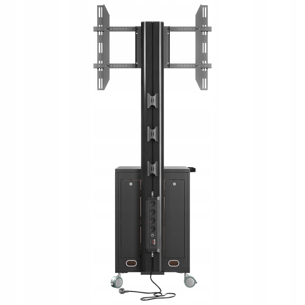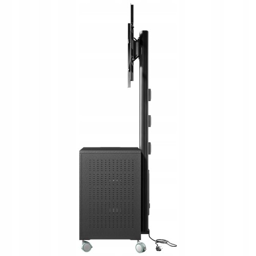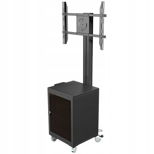 Stojak podłogowy z szafką, przeznaczony do montażu telewizora wraz z osprzętem takim jak odtwarzacz DVD, Blu-Ray czy konsola dogier. Stojak wyposażony w 4-gniazdową listwę zasilającą.