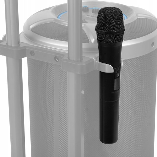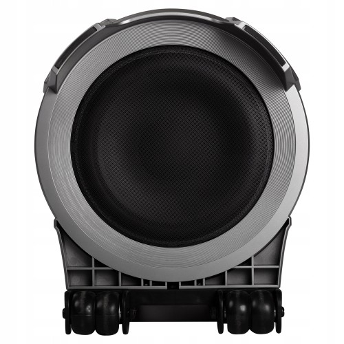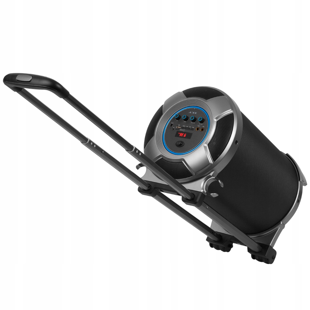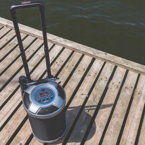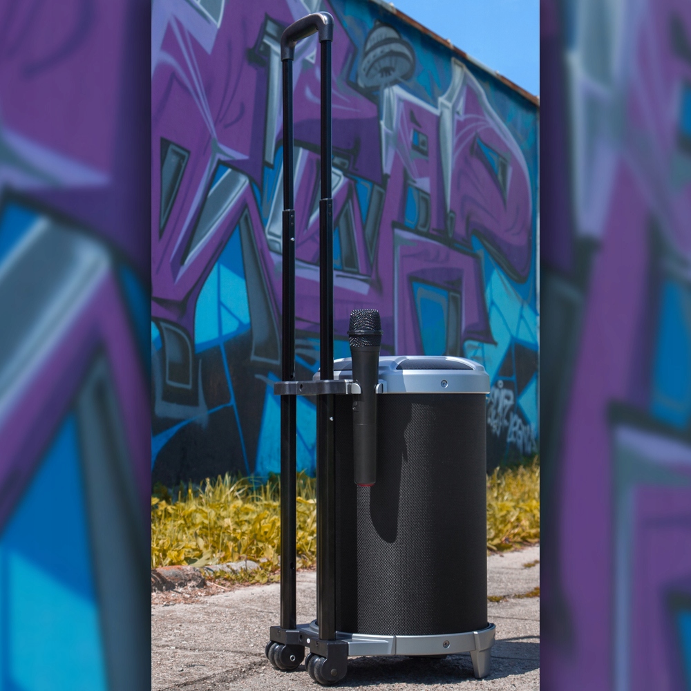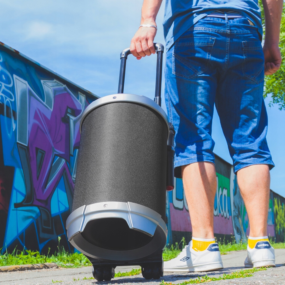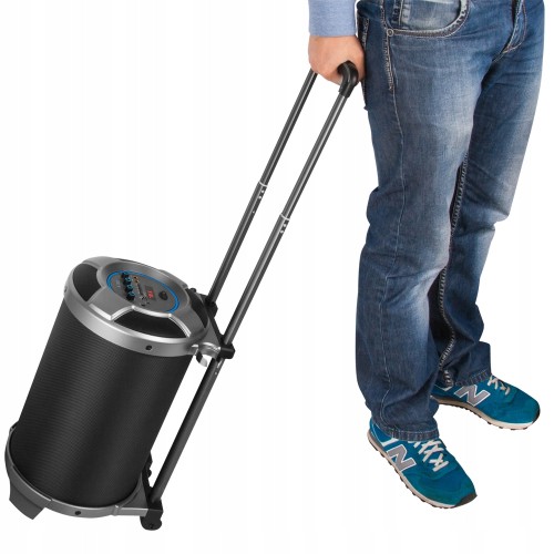 - Podłącz mikrofon lub gitarę wykorzystując gniazdo jack 6,3mm. Kółka oraz teleskopowa rączka umożliwiają komfortowy transport.