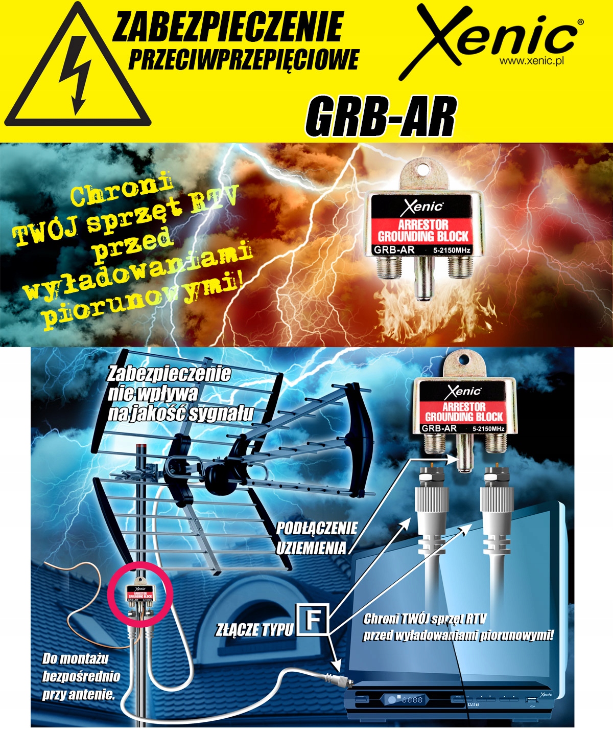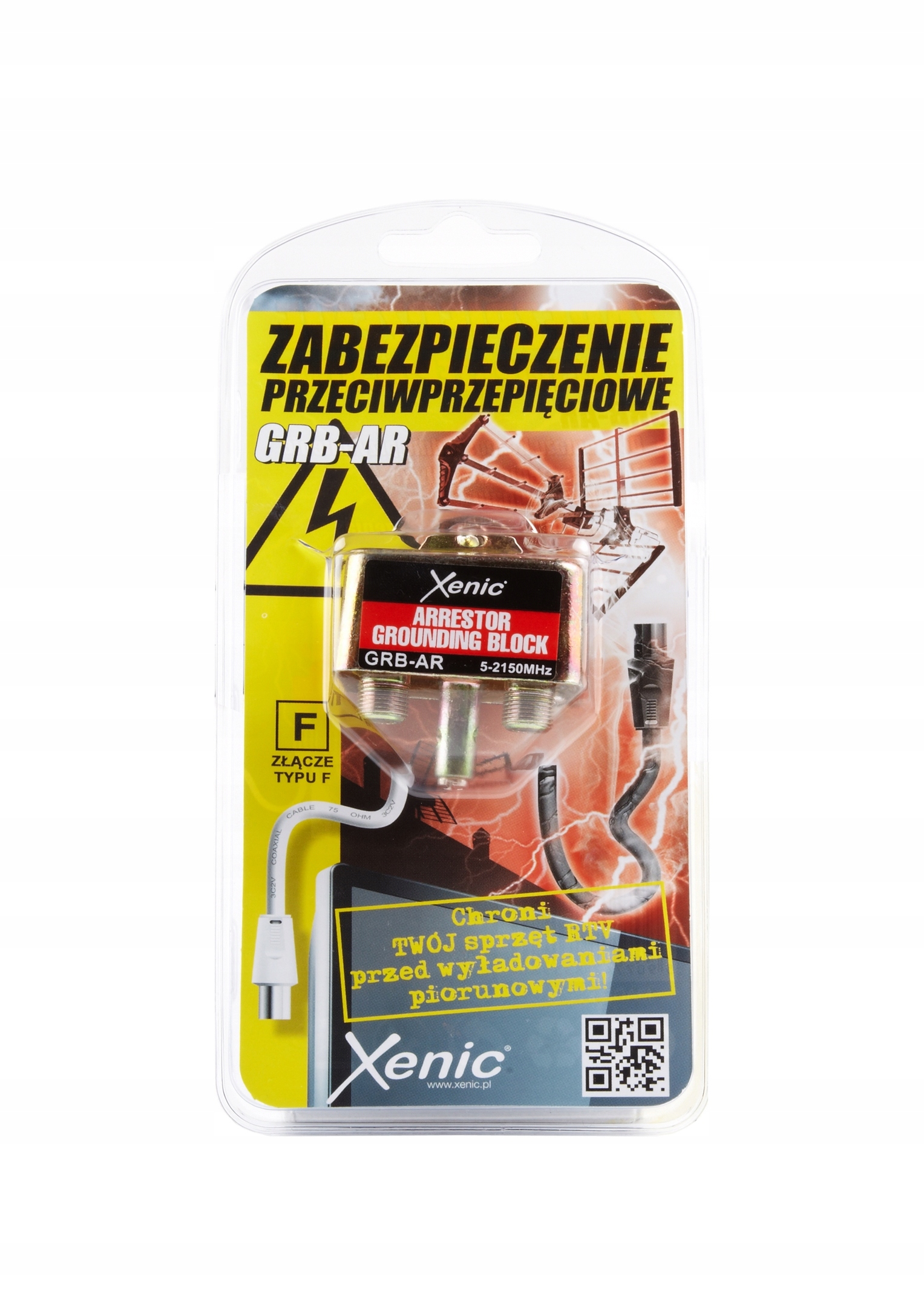 Xenic GRB-AR chroni TWÓJ sprzęt RTV przed wyładowaniami piorunowymi! Do montażu bezpośrednio przy antenie. Zabezpieczenie nie wpływa na jakość sygnału. Posiada możliwość podłączenia uziemienia oraz złącze typu F.